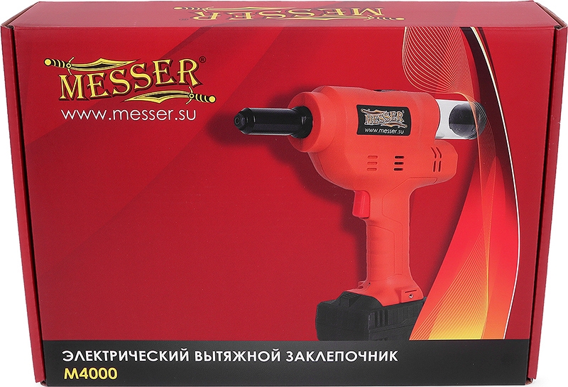 Аккумуляторный электрический вытяжной заклепочник Messer M4000 (Мессер М4000) предназначен для установки любых металлических вытяжных заклепок Ø 2,4 – 4,8 / 5,0 мм, включая нержавеющие стальные вытяжные заклепки.