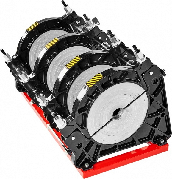 - Центраторо с гидравлическим приводом и 4-мя прочными широкими зажимами, один из которых легко может быть удален для облегчения сварки полимерных фитингов с трубами (тройники, крестовины, отводы), имеет большой запас прочности за счет качественного сплава и ребер жесткости, что позволяет сваривать полимерные трубы с любым показателем SDR