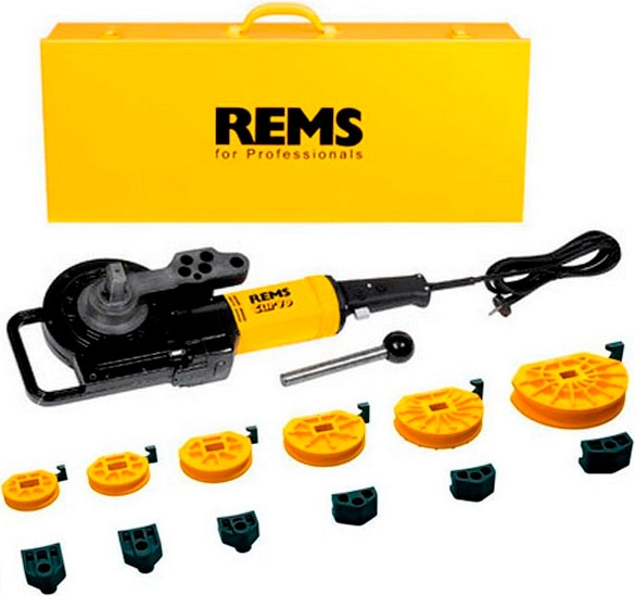 - Rems Курво Сет. Электрический трубогиб Ø 10 – 40 мм, 1/4" – 1 3/8", до 180°. Жесткие, полужесткие, гибкие медные трубы, в том числе тонкостенные, Ø 10 – 35 мм, 3/8" – 1 3/8", мягкие медные трубы в оболочке, в том числе тонкостенные, Ø 10 – 18 мм, толстостенные медные трубы K65 для холодильной техники и систем кондиционирования EN 12735-1 Ø 3/8" – 1 3/8", трубы систем запрессовки из нержавеющей стали Ø 12 – 28 мм, углеродистой стали, в том числе в оболочке, Ø 12 – 28 мм, мягкие трубы из прецизионной стали Ø 10 – 28 мм, стальные трубы EN 10255 Ø 1/4" – 3/4", электромонтажные трубы EN 50086 Ø 16 – 32 мм, композитные трубы Ø 14 – 40 мм и т. д. Электрический привод с не требующим технического обслуживания редуктором с проскальзывающей предохраняющей муфтой, универсальный двигатель 230 В, 50 – 60 Гц, 1000 Вт с бесступенчатым, электронным, толчковым выключателем, правый и левый ход, палец-упор. Сегменты и упоры для гибки. В прочном стальном чемодане.