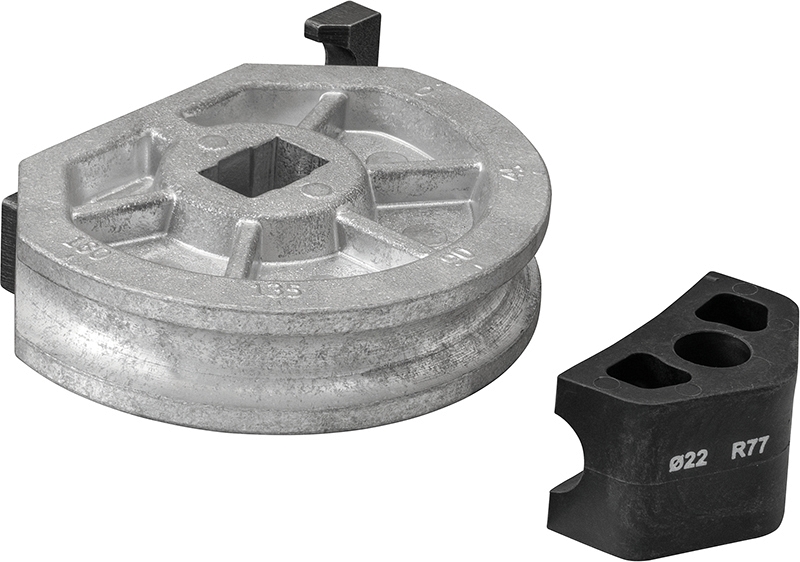 Для труб различной величины, из различных материалов и для различных радиусов гибки. Гибочные сегменты и упоры скольжения 180°, прочные и стойкие к деформации, из высокопрочного, усиленного стекловолокном полиамида или алюминия с высокими скользящими свойствами или гибочные сегменты 90° (D 21,3 R 103, D 26,9 R 102, D 33,7 R 100, D 35 R 100, D 42 R 140, D 42,4 R 140, D 50 R 135, D 1" R 100, D 1 1/4" R 140). Оптимальное согласование гибочного сегмента и упора обеспечивает скольжение в соответствии с материалом без образования гофры и заломов. Шкалы угла на каждом сегменте и маркировка на каждом упоре для более точного изгиба. Быстрая смена насадок. - Гибка по размеру: