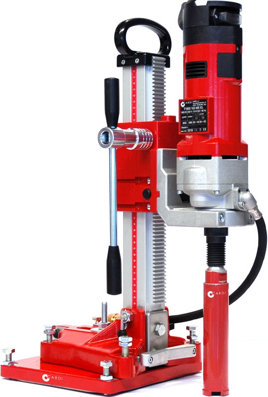 Установка алмазного бурения Cardi 202-K (Карди 202-К) предназначена для сверления отверстий в бетоне, железобетоне Ø 32 – 152 мм и в кирпиче, камне, другом абразивном материале Ø 32 – 202 мм, всухую и с подачей воды, под углом 90°. Идеально подходит под сверление отверстий под перила и ограждения.
