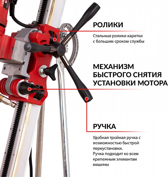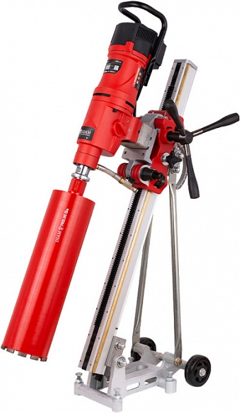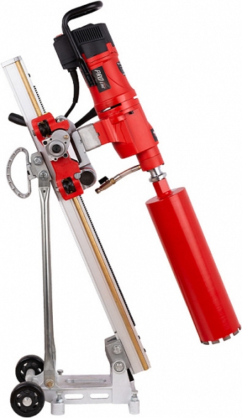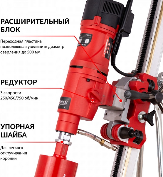 Установка алмазного бурения Diam PL-500/3ADC-1000 (Диам ПЛ-500/3АДЦ-1000) – мощная трехскоростная алмазная сверлильная машина с наклонной стойкой для сверления отверстий в бетоне и железобетоне, кирпичной кладке и других строительных материалах Ø 50 – 500 мм, под углом до 180°, в строительстве, при электромонтажных работах, прокладке сантехнических и вентиляционных труб, отбора проб грунта, высверливании проемов в стенах, а также для частного ремонта.