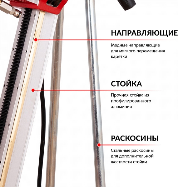 - Алюминиевая колонна со стальным основанием и электродвигатель, закрепленный на рабочей каретке с быстросъемным креплением "ласточкин хвост", которая перемещается по стойке с помощью стальной зубчатой рейки